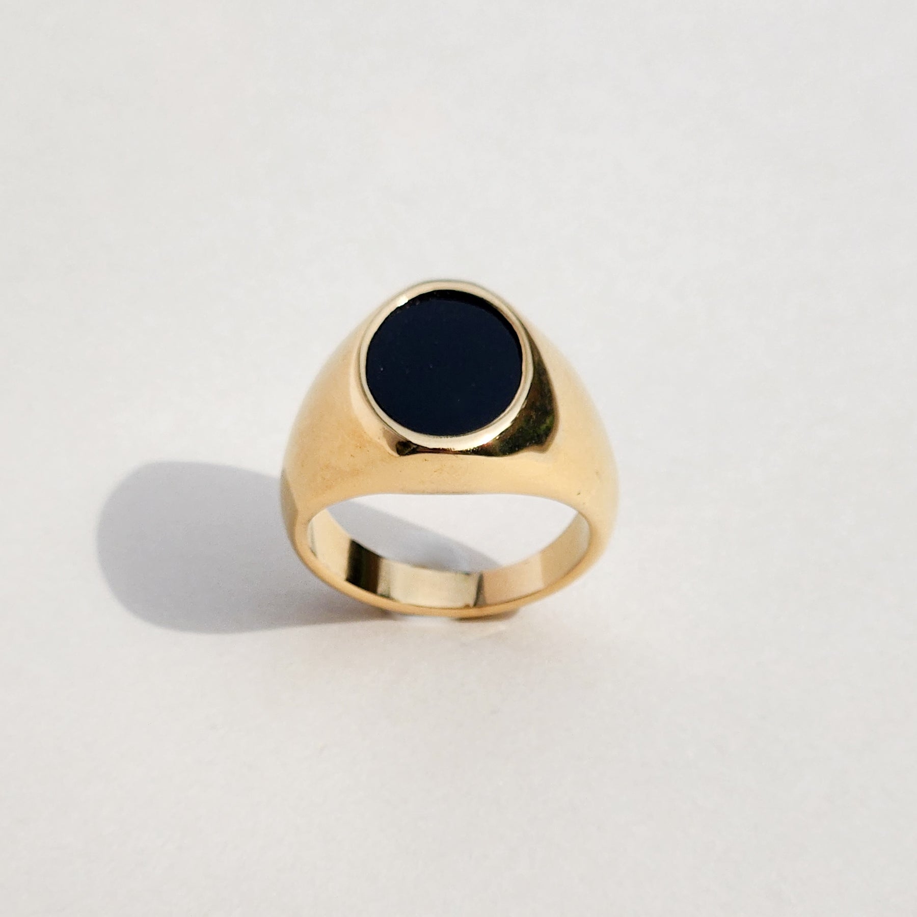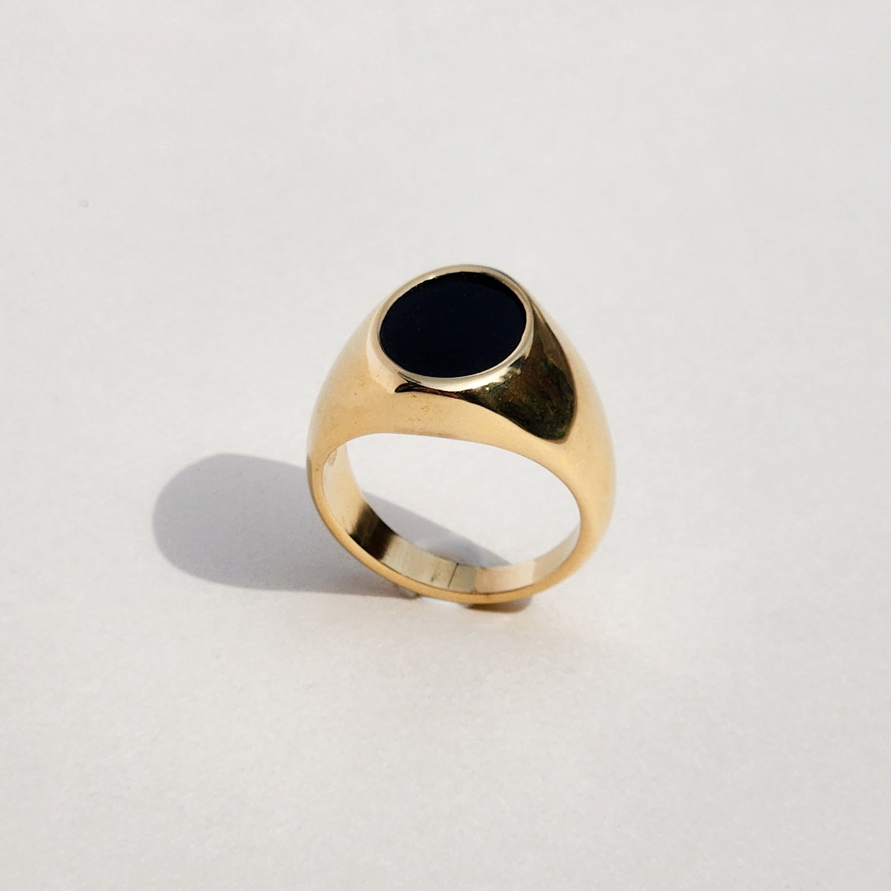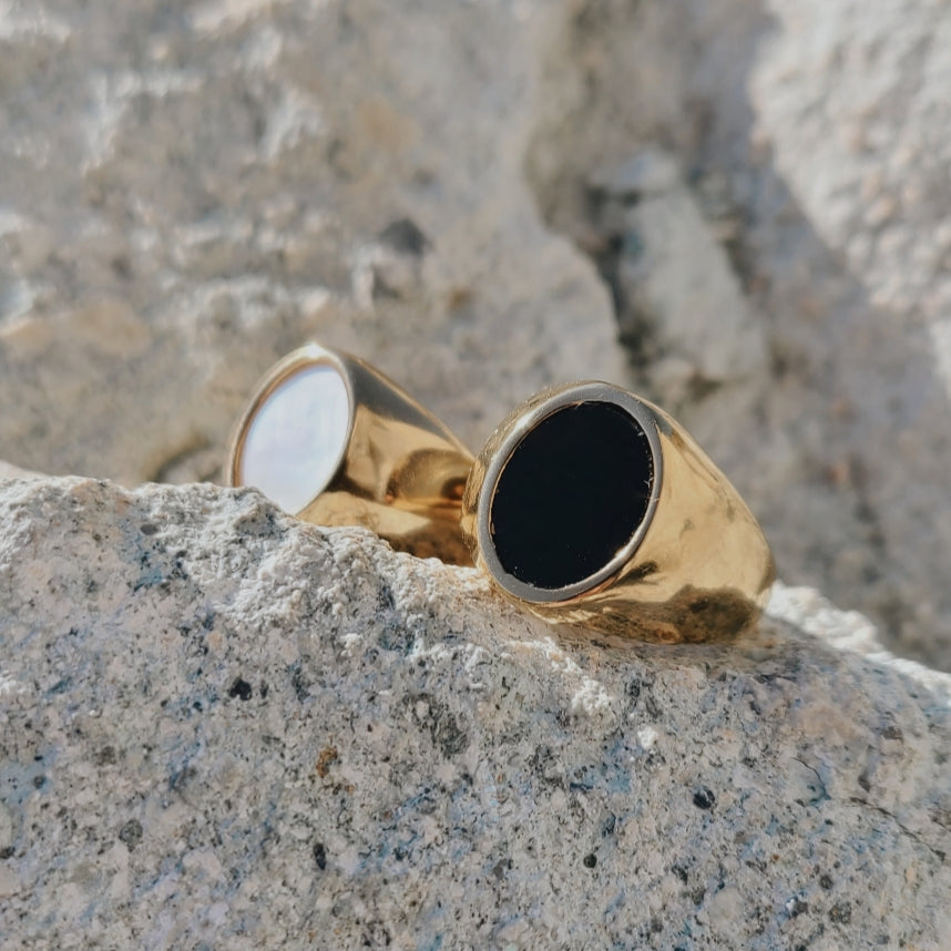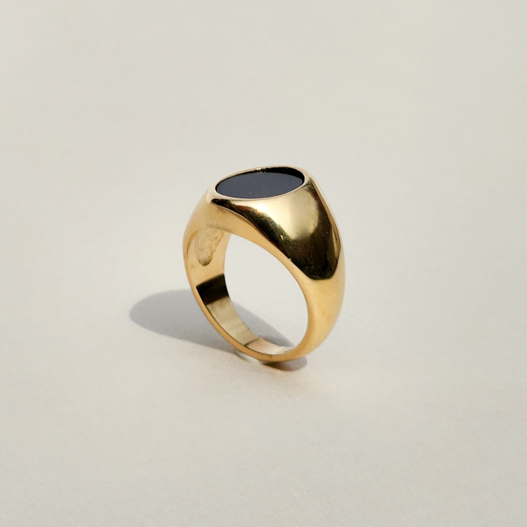 The Lulu ring boasts a sleek design, marrying stainless steel with a captivating black enamel detail that exudes a sense of refined style. Its bold presence is further enhanced by the intricate detailing achieved through an 18k gold PVD plating, adding a luxurious allure to its overall aesthetic.