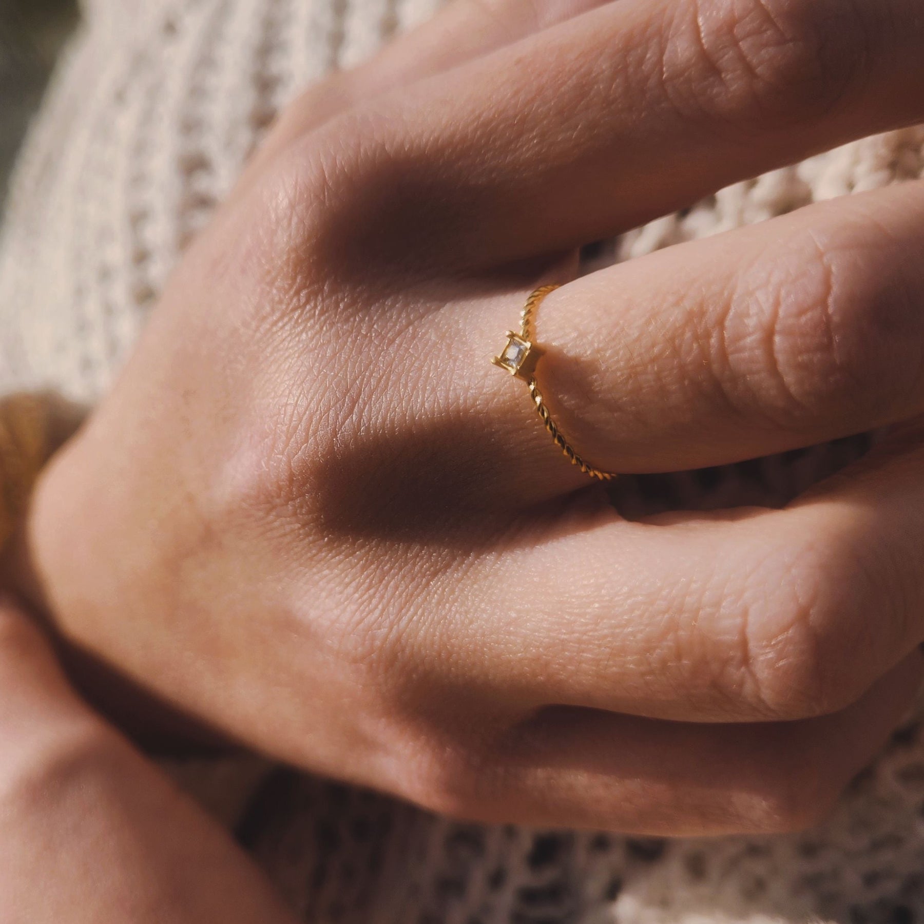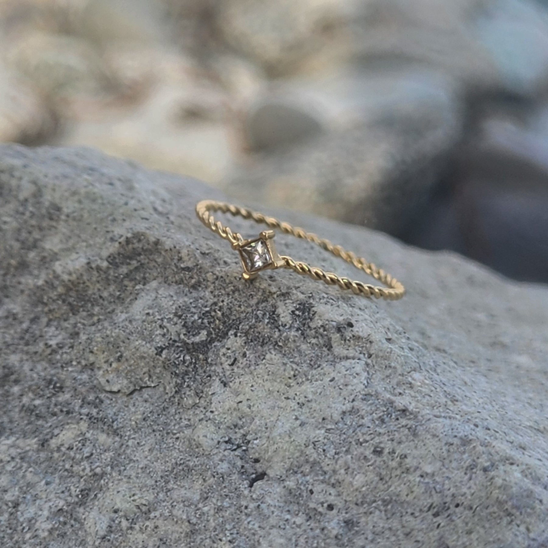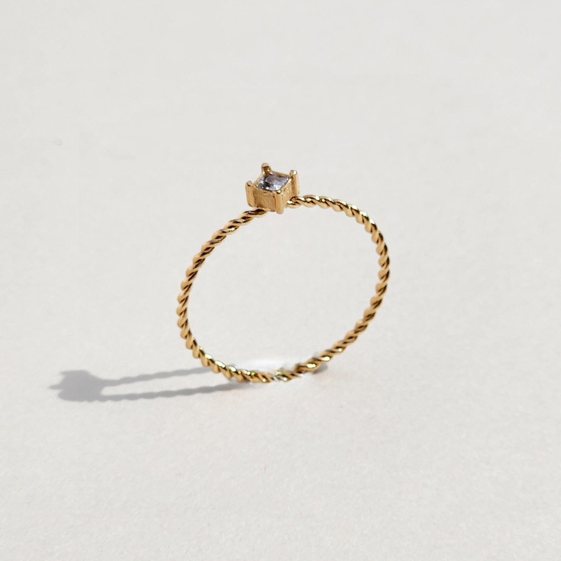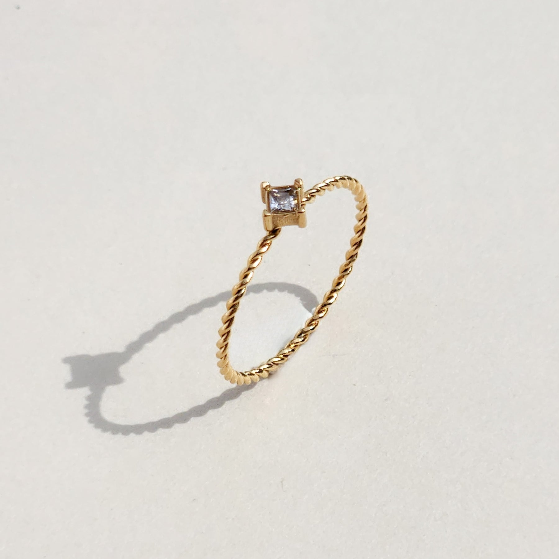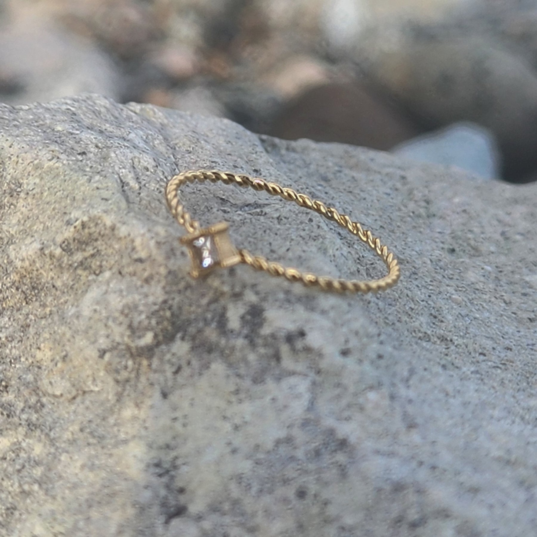 Introducing Ame, a ring that embodies the essence of elegance and sophistication, named after the French word for "soul." This ring is a testament to individuality and timeless beauty, boasting a twisted rope design adorned with a singular cubic zirconia.